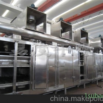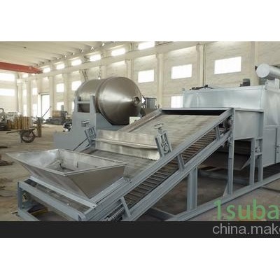 用于脫水蔬菜、一般使用三臺設備串連使用,形成初干段、中間段及終干段。在初干段中,由于物料含水量高。透氣性差,故采用較小的鋪料厚度,較快的運行速度及較高的干燥溫度。初干段中,干燥氣體溫度可高達120oC以上。終干段內物料停留時間是初干段的3-6倍,鋪料厚度是初干段的2-4倍。對于物料溫度不超過60oC的要求,可采用80oC左右的干燥氣體。采用多段組合能更好地發(fā)揮帶式干燥機的性能,且干燥更均勻。