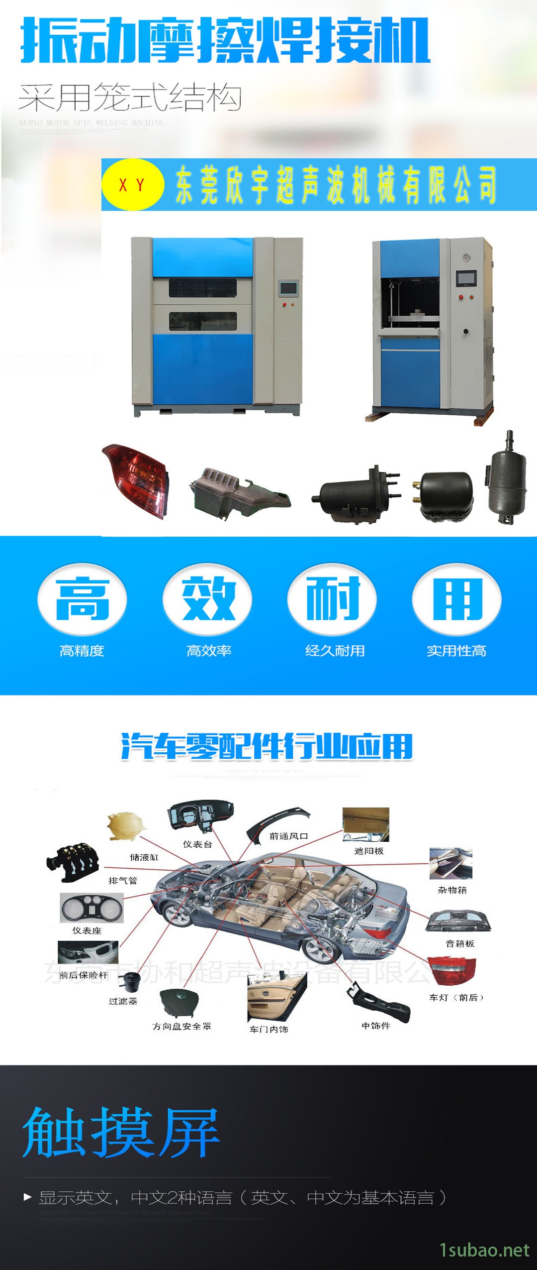本機使用便于操作的觸摸屏控制顯示及專用控制軟件。熔接強度高、品質好,多用于大型汽車零部件、塑膠產品、 ???家電用品、辦公自動化零件業