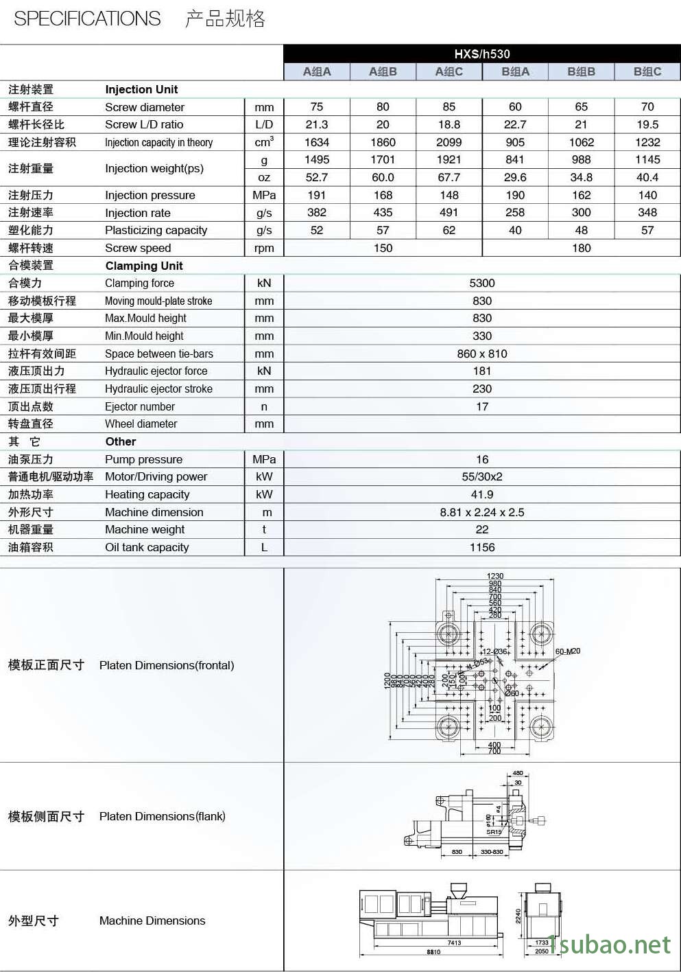 | 電動機功率: | 55/30×2kw | 合模力: | 5300kN |
