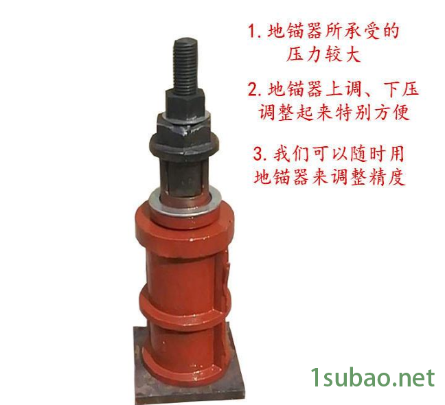 1.主要用于大型組裝平臺,大型鋪地平板,大型拼裝平臺等的調整水平用,使多塊平臺能調整成一個平面度,比墊鐵好調,方便,不易變動。主要用于裝配平臺,鉚焊平臺,焊接平臺,拼接平臺面積大我們恒博鑄業可以隨時用地錨器來調整精度,而普通的調整螺栓 致命的缺點就是一旦平臺精度出現偏差將無法用它進行二次調整,優點有以下幾點:1.地錨器所承受的壓力較大;